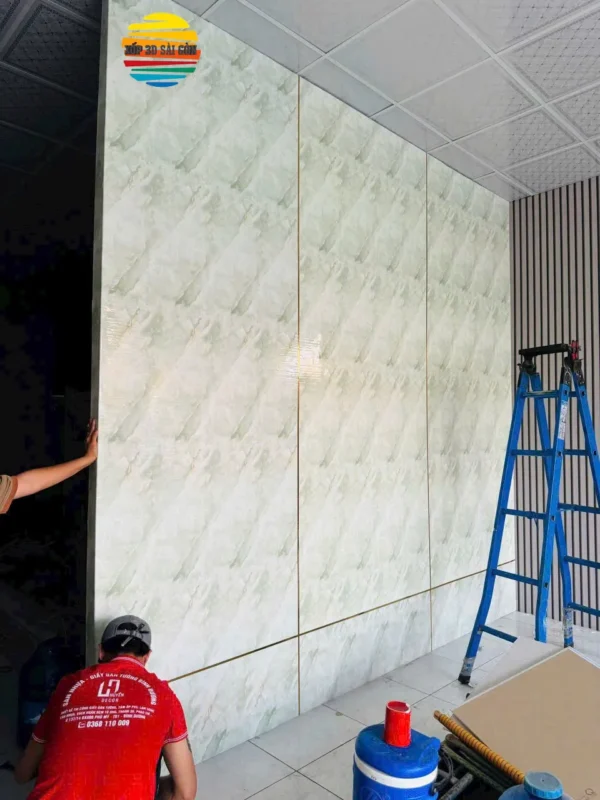 PVC là dòng vật liệu được ưa chuộng nhờ độ bền cao, chống ẩm, chống mối mọt, bề mặt sang trọng, dễ lau chùi. Tấm PVC có nhiều hoa văn hiện đại, giả đá, giả gỗ, giúp không gian trông mới mẻ và cao cấp hơn rõ rệt.